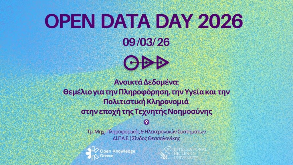 Τη Δευτέρα 9 Μαρτίου 2026 στις 10:00πμ, το Ίδρυμα Ανοικτής Γνώσης Ελλάδος σε συνεργασία με το Διεθνές Πανεπιστήμιο της Ελλάδος (ΔΙΠΑΕ) διοργανώνουν ημερίδα με τίτλο “Open Data Day 2026: Τα Ανοικτά Δεδομένα ως θεμέλιο για την Πληροφόρηση, την Υγεία και την Πολιτιστική Κληρονομιά στην εποχή της Τεχνητής Νοημοσύνης”. Πιστοί στο ραντεβού μας, με την ημέρα θεσμό για τα Ανοικτά Δεδομένα, σας καλούμε όλες και όλους να συμμετέχετε στην ετήσια εκδήλωση για τη δύναμη των Ανοικτών Δεδομένων, στο Κεντρικό Αμφιθέατρο Ηλεκτρονικής, Τμήμα Μηχανικών Πληροφορικής και Ηλεκτρονικών Συστημάτων, στο Διεθνές Πανεπιστήμιο Ελλάδος στη Σίνδο Θεσσαλονίκης.